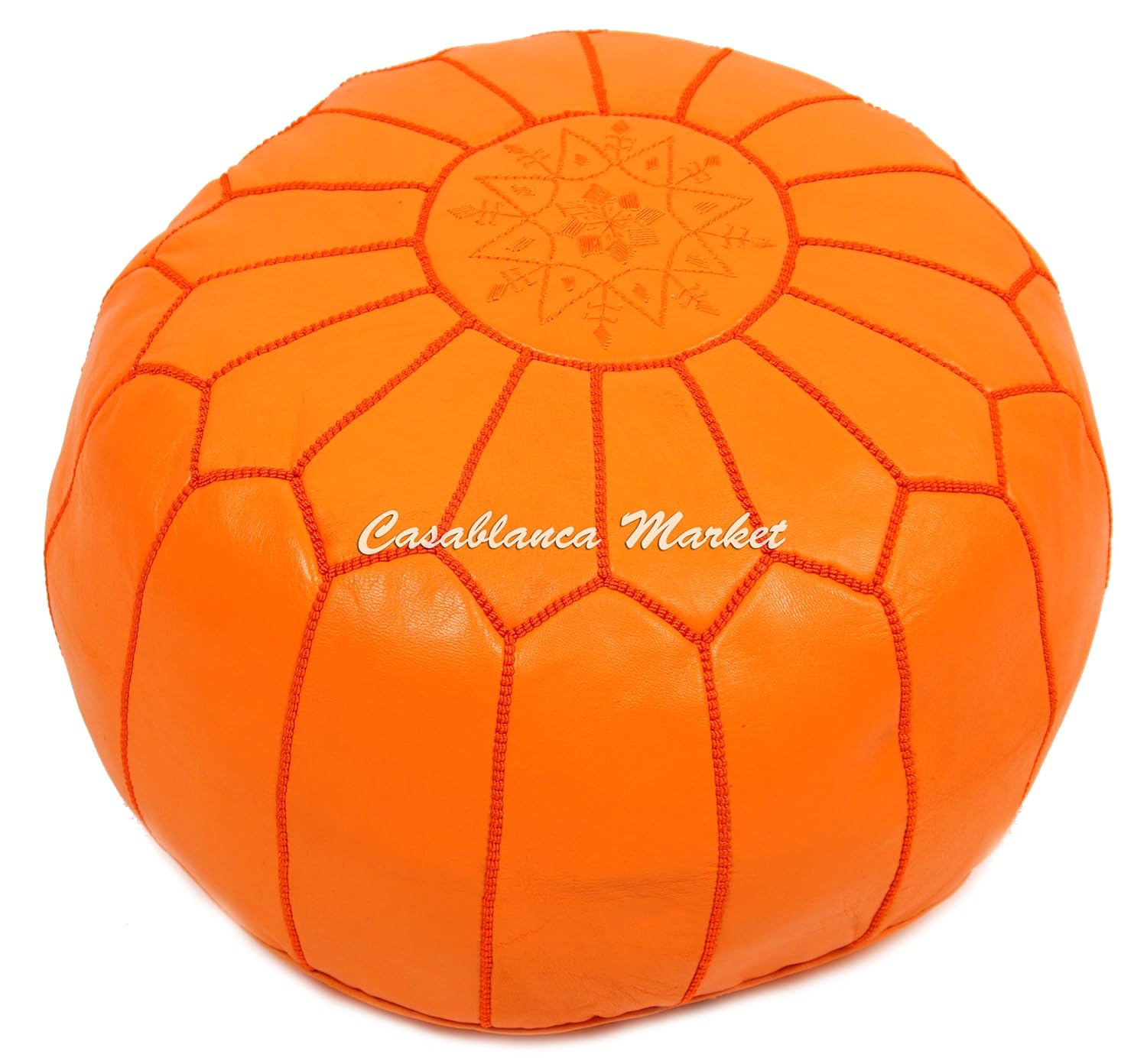 Moroccan Embroidered Leather Pouf, Orange (Stuffed)